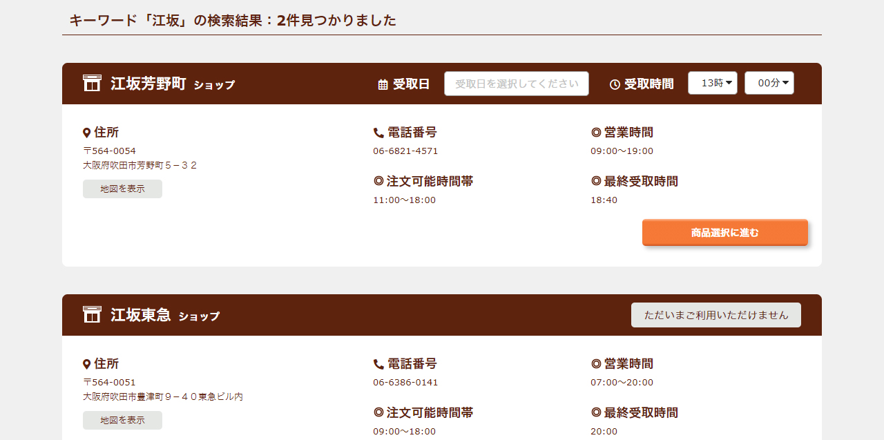 受取時間になったら直接「受け取りカウンター」にお越しいただき、スタッフに注文完了画面または確定お知らせメールに記載された「受取番号」をお伝えください。