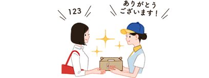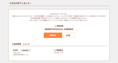 受取時間になったら直接「受け取りカウンター」にお越しいただき、スタッフに注文完了画面または確定お知らせメールに記載された「受取番号」をお伝えください。